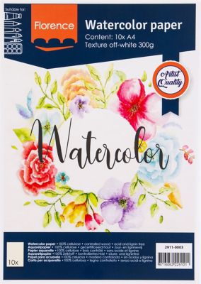Bloc de papier aquarelle "Florence", blanc, format : A4, grammage : 300 g/m², surface rugueuse, sans acide ni lignine, idéal pour la peinture aquarelle, contenu : 10 feuilles.