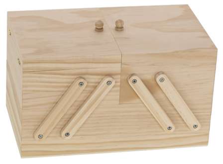 Boîte à couture en bois, avec deux petits et un grand compartiments de rangement, pour y ranger différents ustensiles, couleur : bois nature, dimensions : 26 x 16,6 x 16,4 cm.