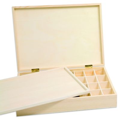 Boîte de rangement en bois brut, pour ranger des boutons, bijoux et d'autres accessoires, à décorer individuellement avec de la peinture, des serviettes en papier, etc., avec 32 petits compartiments (dim. d'un compartiment : 4 x 6 cm) et planche de séparation de 31,5 x 22 cm, dim. totale de la boîte : 36 x 26 x 7 cm.