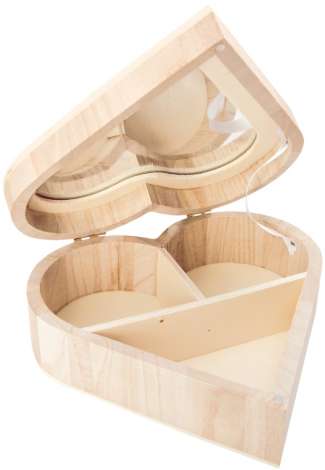 Boite "coeur", en bois brut, avec 3 compartiments et un miroir en forme de cœur dans le couvercle. Dim. : 16 x 16 x 5,5 cm.