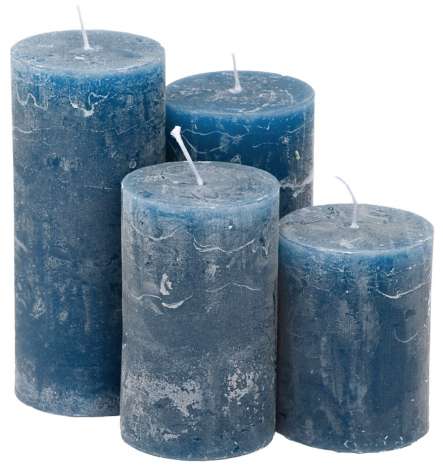 Bougies rustiques, couleur : pétrole, dimensions : Ø 6 cm, hauteurs dégradées de 8 cm, 10 cm, 12 cm et 14 cm. Contenu : 4 pièces.