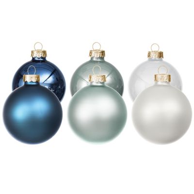Boules de Noël en verre, couleur : bleu foncé, bleu clair et blanc, dim. : 6 cm Ø, contenu : 6 pièces mates et 6 pièces brillantes = 12 boules.