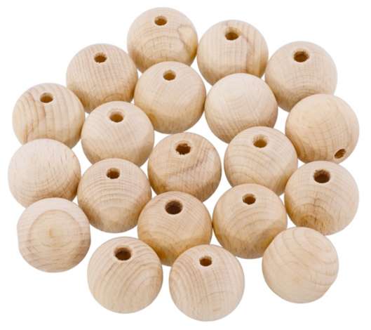 Boules en bois de hêtre, poncées et polies, percées, couleur : bois brut, dimension : 30 mm Ø, dimension trou : env. 6 mm Ø, contenu : 20 pièces.