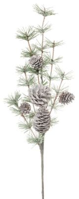 Branche de pin avec 5 pommes de pin, saupoudrée de neige artificielle et avec des paillettes, longueur totale : 50 cm, longueur tige : 20 cm.