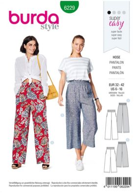 burda Patron "jupe-culotte", instructions pour 2 modèles, tailles 34 à 44, niveau de difficulté : très facile, tissu recommandé : tissus tissés légers (lin, crêpe, viscose, coton, satin).