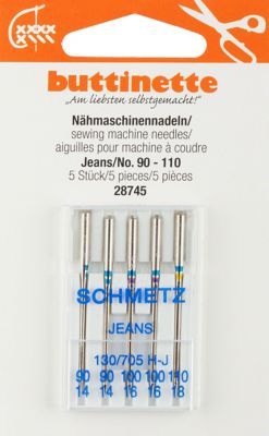 buttinette Aiguilles pour machine à coudre "jeans", à talon plat, en acier, pour des tissus jeans, imitation cuir, etc., épaisseur : 2x 90, 2x 100, 1x 110, contenu : 5 pièces.