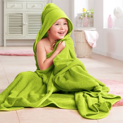 buttinette Cape de bain pour enfant, couleur : citron vert, à broder individuellement pour votre propre enfant ou à offrir. Dimensions de la bande Aïda : 8 x 42 cm (placée sur la capuche). Dimensions : 140 x 140 cm. Composition : 100 % coton (env. 7 points/cm). Poids : env. 360 g/m².