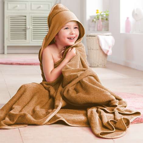 buttinette Cape de bain pour enfant, couleur : marron clair, à broder individuellement pour votre propre enfant ou à offrir. Dimensions de la bande Aïda : 8 x 42 cm (placée sur la capuche). Dimensions : 140 x 140 cm. Composition : 100 % coton (env. 7 points/cm). Poids : env. 360 g/m².