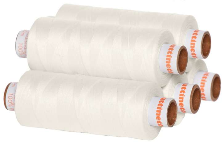 buttinette Fil à coudre universel, couleur : blanc cassé, grosseur du fil : 100, épaisseur d’aiguille conseillée : 60-100, contenu : 5 bobines, 500 m par bobine. Composition : 100 % polyester.