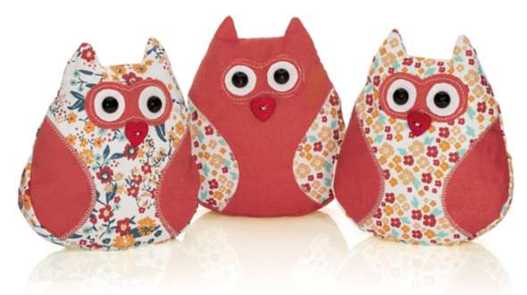 Dimensions des chouettes finies : 12 x 12 x 4 cm, contenu : 3x tissu coton (100 % coton) de 75 x 20 cm, 1x entoilage thermocollant (55 % viscose, 45 % polyester), 1x fil à coudre (100 % polyester), 150 granulés de rembourrage (100 % polypropylène), 6x demi-perles en plastique, 3x boutons en forme de cœur en plastique, notice explicative et patron.