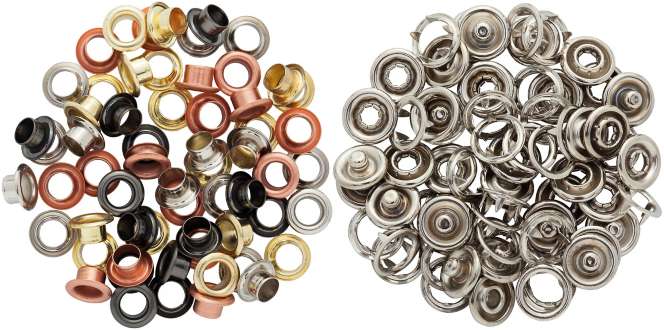 buttinette Lot de recharge "œillets et boutons pression", contenu : 100 œillets, couleurs : doré, cuivré, noir, argenté, dimensions : 5 mm Ø (intérieur) et 30 boutons pression, couleur : argenté, dimensions : 9 mm Ø. Composition : acier.