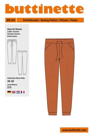 buttinette Patron "pantalon" pour femme, exclusivité buttinette, tailles 36 à 54, niveau de difficulté : 2/5, tissu recommandé : sweat, French Terry, nicky, polaire, jersey (romanite).