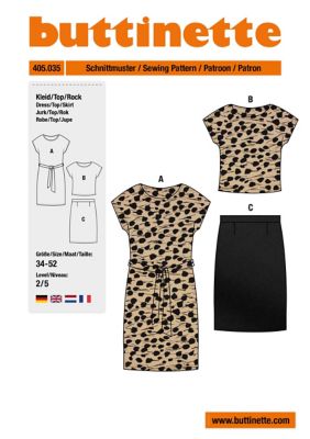 buttinette patron "robe et chemisier à manches courtes avec jupe" pour femmes, en exclusivité chez buttinette, instructions pour 3 modèles, tailles : 36-54, niveau de difficulté 2/5, tissu conseillé : tissé légèrement fluide, éventuellement avec de l'élasthanne comme du coton léger, de la viscose, du lin ou du crêpe.