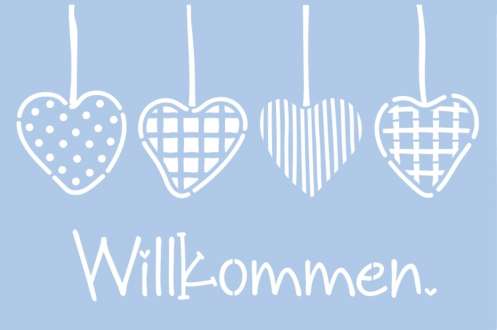 buttinette Pochoir "cœurs", en plastique, couleur : transparent, dim. : 59 x 39 cm. Attention : le pochoir comprend l´écriture en allemand "Willkommen".