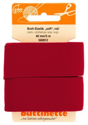 buttinette Ruban élastique souple "large", particulièrement doux et souple, couleur : rouge, largeur : 40 mm, longueur : 5 m. Composition : 60 % polyamide, 20 % polyester, 20 % caoutchouc.
