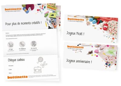 Vous êtes en panne d'idée cadeau ? Voici un cadeau original de buttinette ! Nous vous proposons un chèque-cadeau pour notre boutique en ligne.