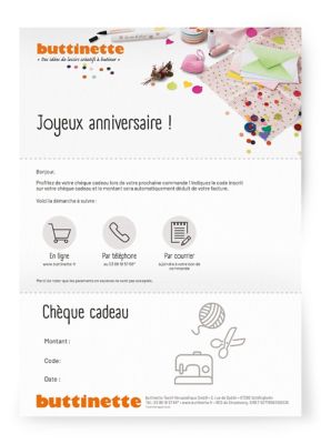 Vous êtes en panne d'idée cadeau ? Voici un cadeau original de buttinette ! Nous vous proposons un chèque-cadeau pour notre boutique en ligne.