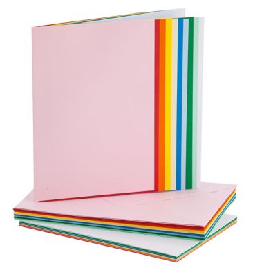Lot de cartes doubles et enveloppes, couleurs : multicolore, dim. cartes : 48 x 210 mm (A5), grammage 240 g/m², dim. enveloppes : 162 x 229 mm (C5), grammage 120 g/m². Contenu : 20 cartes et 20 enveloppes.