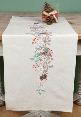 Chemin de table à broder "en hiver", à broder au point de croix. Motif préimprimé, ourlé prêt à l’emploi. Kit complet : notice explicative, fils, aiguille à broder. Couleur du tissu : lin. Dimensions : 35 x 95 cm. Composition : tissu et fils 100 % coton.