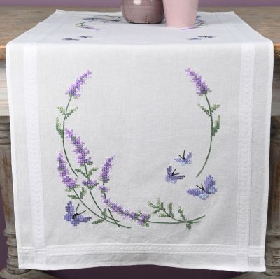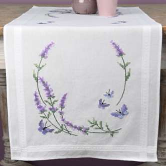 Chemin de table "le temps des lavandes" à broder au point de croix, point lancé et point de tige. Motif préimprimé, bordure tissée et ourlé prêt à l’emploi. Kit complet : instructions, fils, aiguille à broder. Couleur du tissu : blanc. Dimension : 40 x 100 cm. Composition : tissu et fil 100 % coton.