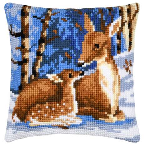 Coussin point de croix "biche et faon dans forêt hivernale". Super facile à broder, convient aux enfants à partir de 8 ans. Kit complet : notice explicative, fils, aiguille à broder. Sans dos ni coussin de rembourrage. Dimensions : 40 x 40 cm. Composition : tissu canevas peint à la main 100 % coton (env. 18 points/10 cm), fil 100 % polyacrylique.