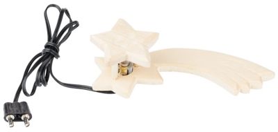 Étoile filante en bois, avec éclairage LED, avec prise mâle basse tension 3,5 V, dim. : 9 x 3,5 cm, longueur câble : 49 cm.