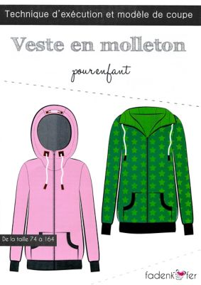 Fadenkäfer Patron "Veste en molleton" pour enfants, taille : 74 - 164 (taille française : 6M - 13A), niveau de difficulté : moyen, tissu recommandé : tissu sweat-shirt, tissu sweat-shirt estival, tissu romanite, tissu jersey solide, tissu polaire, tissu maille.