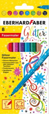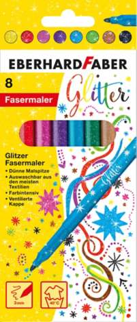 Feutres à paillettes, couleurs : multicolore, épaisseur de la mine : 3 mm, avec bouchons anti-étouffement, lavables sur la majorité des tissus. Contenu : 8 feutres. Recommandé pour des enfants à partir de 3 ans.