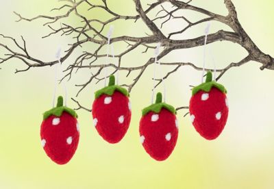 Fraises, feutrées, couleur : rouge/blanc/vert, dimension : 10 cm, contenu : 4 fraises. Composition : 100 % polyester.