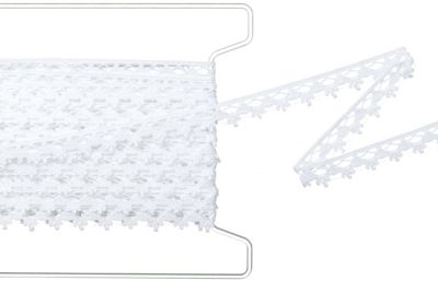 Galon de dentelle aux fuseaux, couleur : blanc, largeur : 1,3 cm, longueur : rouleau de 5 m. Composition: 100 % coton.