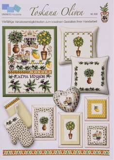 Grille de broderie "Toscane Olives". Avec cette feuille de modèles de point de croix, vous créez pour votre maison de charmantes pièces uniques à l'ambiance méditerranéenne. Laissez votre âme s'évader en brodant et profitez de la diversité des idées pour créer vos propres variations au point de croix. Des branches d'olivier, des citronniers, des bordures de style méridional ou des pots en terre cuite comme décorations brodées... laissez-vous inspirer. Livret de 6 pages, avec instructions de base et modèle de comptage en couleur. Dimensions : 21 x 29,5 cm.