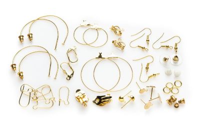 Kit pour confection de boucles d'oreilles, couleur : doré, contenu : 4 crochets avec ressort de 20 mm, 6 crochets avec œillet de 15 mm, 2 paires de créoles ouvertes, 2 clous d'oreilles de 10 mm, 2 clous d'oreilles de 8 mm, 2 clous boule avec œillet de 10 mm, 2 arrêts de 7 mm, 2 pendentifs créole avec anneau de 20 mm, 2 pendentifs créole avec anneau de 30 mm, 2 brisures de 15 mm, 4 clips de 15 mm. Composition : laiton.