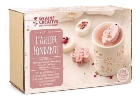 Kit créatif « L'atelier fondants », de la marque « La Graine Créative », contenu : 1 lampe aromatique en céramique, 150 g de cire de colza, des colorants solides, 1 bougie chauffe-plat, 1 moule (4 motifs différents), 10 ml d'huile parfumé (rose), des pétales de rose et une notice explicative.