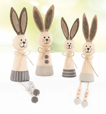 Kit créatif "lapins en bois", exclusivité buttinette, le contenu est suffisant pour bricoler 4 lapins de deux tailles différentes. Contenu : 2 cônes pour figurines de 60 mm de haut, 2 cônes pour figurines de 70 mm de haut, 8 perles en bois de Ø 10 mm, 24 perles en bois de Ø 6 mm, 1 feutre de bricolage 10 x 15 cm en marron clair, 1 feutre de bricolage 10 x 15 cm en marron foncé, 2 mètres de corde en fibres naturelles ainsi qu'une notice.