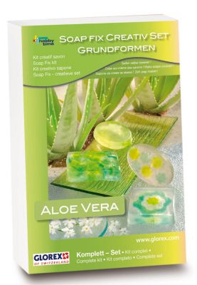 Kit moulage savon "aloe vera", contenu : 1 moule (avec les formes : rond, oval, carré, rectangle) 300 g de savon écologique aloès transparent, colorant naturel vert et jaune, 2 mini emporte-pièces, bâtonnets en bois pour mélanger, mode d´emploi. Dimension des motifs : 5 - 8 cm.
