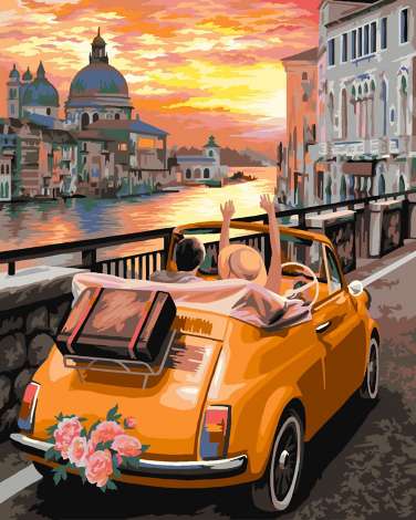 Kit peinture par numéros "bon voyage", dim. : 40 x 50 cm, contenu : peintures acryliques, 1 châssis entoilé avec motif préimprimé, 1 set de pinceaux, 1 notice explicative.