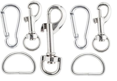 Lot d'accessoires pour sacs, 7 pièces, pour confectionner des sacs, comprenant 1 mousqueton (6,5 x 2,5 cm, acier), 2 mousquetons (4,5 x 1,8 cm, acier), 2 mousquetons à ressort (4 x 2 cm, aluminium) et 2 anneaux en D (3 x 2 cm, acier).