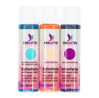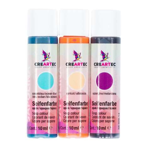 Lot de colorants pour savon "été", contenu : 3x 10 ml. Pour colorer le savon fondu. Convient pour du savon liquide blanc et transparent. Couleurs : aubergine, abricot et bleu océan.