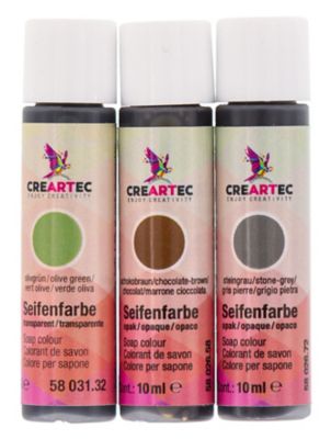 Lot de colorants pour savon, contenu : 3x 10 ml. Pour colorer le savon fondu. Convient pour du savon liquide blanc et transparent. Couleurs : gris pierre, chocolat, olive.