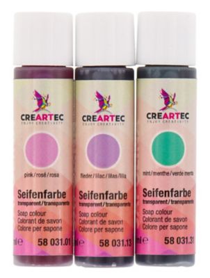 Lot de colorants pour savon, contenu : 3x 10 ml. Pour colorer le savon fondu. Convient pour du savon liquide blanc et transparent. Couleurs : rose pâle, lilas, menthe.