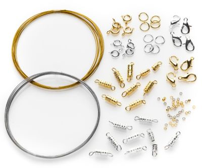 Lot de fermoirs pour bijoux, doré/argenté. Contenu : 8 fermoirs mousqueton, 8 anneaux, 8 fermoirs à ressort, 16 fermoirs à visser, 20 perles à écraser et respectivement 2 m de fil d'acier. Composition : laiton.