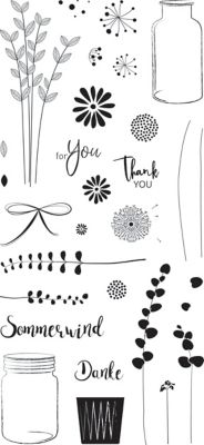 Lot de tampons clear "botanique", souples et transparents, pour la confection de cartes, étiquettes cadeaux, etc. Dimensions des motifs : 0,7-8,7 cm, contenu : 30 motifs avec texte en anglais et en allemand.