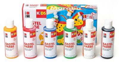 Marabu KIDS Peintures pour enfants, à base d'eau, idéal pour beaucoup de surfaces comme papier, carton, bois, pierre, verre ou céramique. Les peintures peuvent être appliquées à l'aide de pinceaux, éponges ou spatules. Très couvrant, séchage rapide, diluable à l'eau et lavable à 30° C (appliquez de l'eau savonneuse sur la peinture avant le lavage). Vous pouvez mélanger plusieurs peintures. Contenu : 6x 80 ml dans les couleurs : jaune, rouge, bleu, vert, blanc et noir. Recommandé pour des enfants à partir de 3 ans.