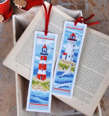 Kit broderie : Marque-pages "phare mer du Nord" pour 2 marque-pages, à broder selon la grille au point de croix et point arrière (env. 5,4 points/cm). Kit complet : notice explicative, grille des motifs, ruban de satin rouge, fils et aiguille à broder. Couleur de la toile : blanc. Dimensions : 6 x 20 cm. Composition: toile Aïda et fils 100 % coton.