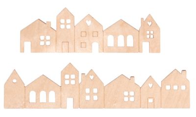 Mini maisons en bois plaqué, couleur : naturel, dimensions : 2x 14 x 3,5 cm, 2x 10,5 x 3,5 cm, contenu : 4 pièces.