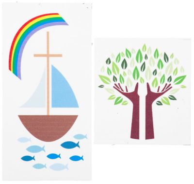 Motifs en cire "bateau et arbre", multicolore, pour décorer des bougies de baptême, de communion et de confirmation, dim. : 10 x 5 cm et 6 x 6 cm.