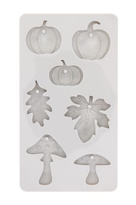 Moule en silicone « automne », 7 motifs, dimensions motifs : grande citrouille 56 x 57 mm, citrouille moyenne 52 x 49 mm, petite citrouille 50 x 38 mm, feuille chêne 37 x 68 mm, feuille érable 69 x 70 mm, grand champignon 60 x 75 mm et petit champignon 54 x 46 mm, hauteur : 9 mm, résistant au gel et à la chaleur. Consommation : pâte de moulage env. 150 g, béton env. 200 g. Dimension moule : 14,5 x 26 x 1 cm.