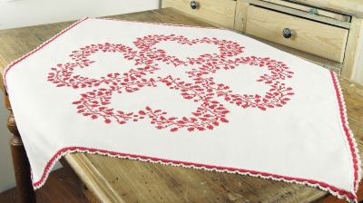 Nappe à broder "4 cœurs", crème, ourlé d'un ruban dentelle, motif pré-imprimé. Kit complet : notice explicative, fils, aiguille.
