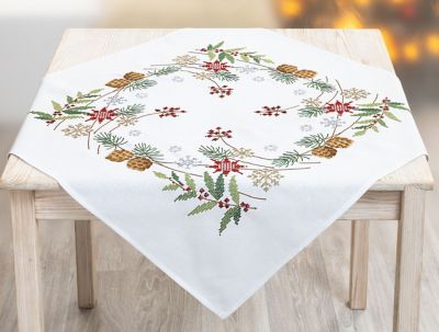 Nappe à broder "en hiver", à broder au point de croix. Motif préimprimé, avec bords tissés, ourlé prêt à l’emploi. Kit complet : notice explicative, fils, aiguille. Couleur du tissu : blanc. Dimensions : 72 x 72 cm. Composition : tissu et fils 100 % coton.