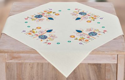 Nappe à broder "fleurs art graphique", à broder au point avant, point lancé, point de nœud et point de tige. Motif préimprimé, ourlé prêt à l’emploi. Kit complet : mode d'emploi, fils, aiguille à broder. Couleur du tissu : blanc. Dimensions : 72 x 72 cm. Composition : tissu et fils 100 % coton.